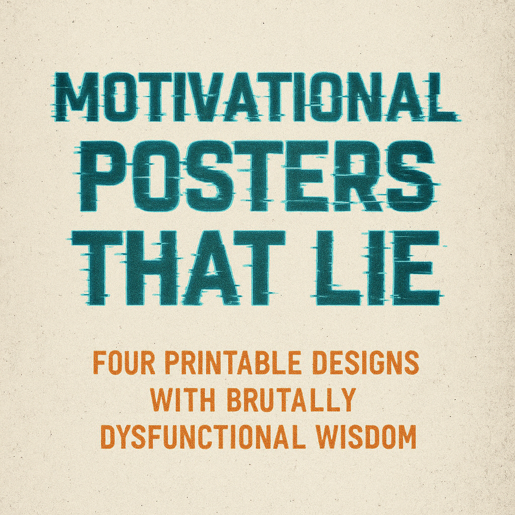 Motivational Posters That Lie – Vol. 1 Gaslight your walls. Deceive your desk. Decorate your downfall. These aren’t your average feel-good affirmations. This printable poster set is built for burned-out creatives, exhausted dreamers, and anyone whose coffee mug says "ambition" but is full of despair. 🧠 What’s Inside: 15 printable 8.5x11" posters (retro typewriter style) Each poster includes: a hilariously misleading motivational quote a brutally honest translation underneath BONUS: printable cut-out misfortune strips for daily doom decor 🖤 Why Buy This? They look classy. They sound inspiring. They lie to you in beautiful fonts. And they won’t ask you to “rise and grind.” Print at home, tape to your mirror, frame for your office, or gift to your favorite burnout.